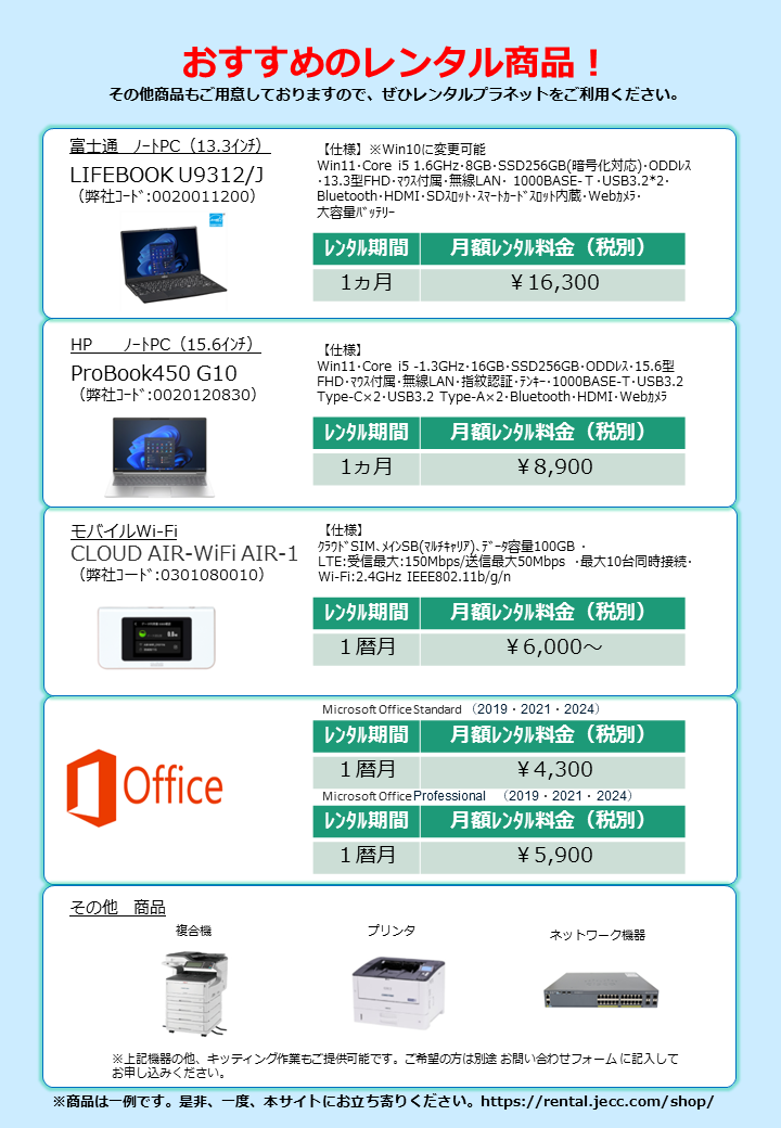 - 「パソコンがすぐに必要」「短期間だけ使いたい」「有事に備え代替機を用意したい」等のご要望がございましたら、是非JECCにご相談ください。